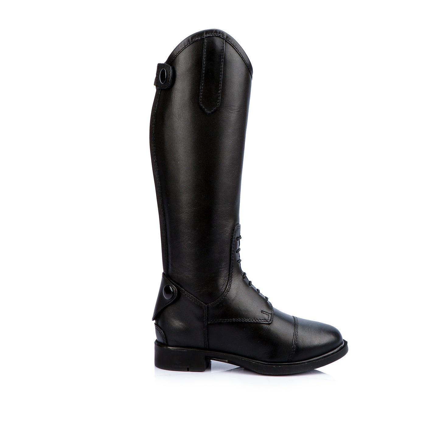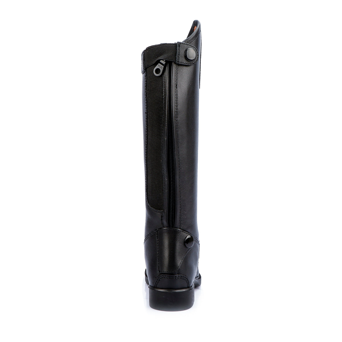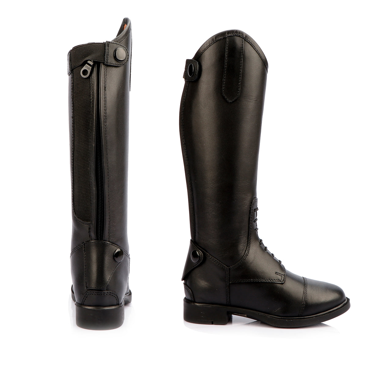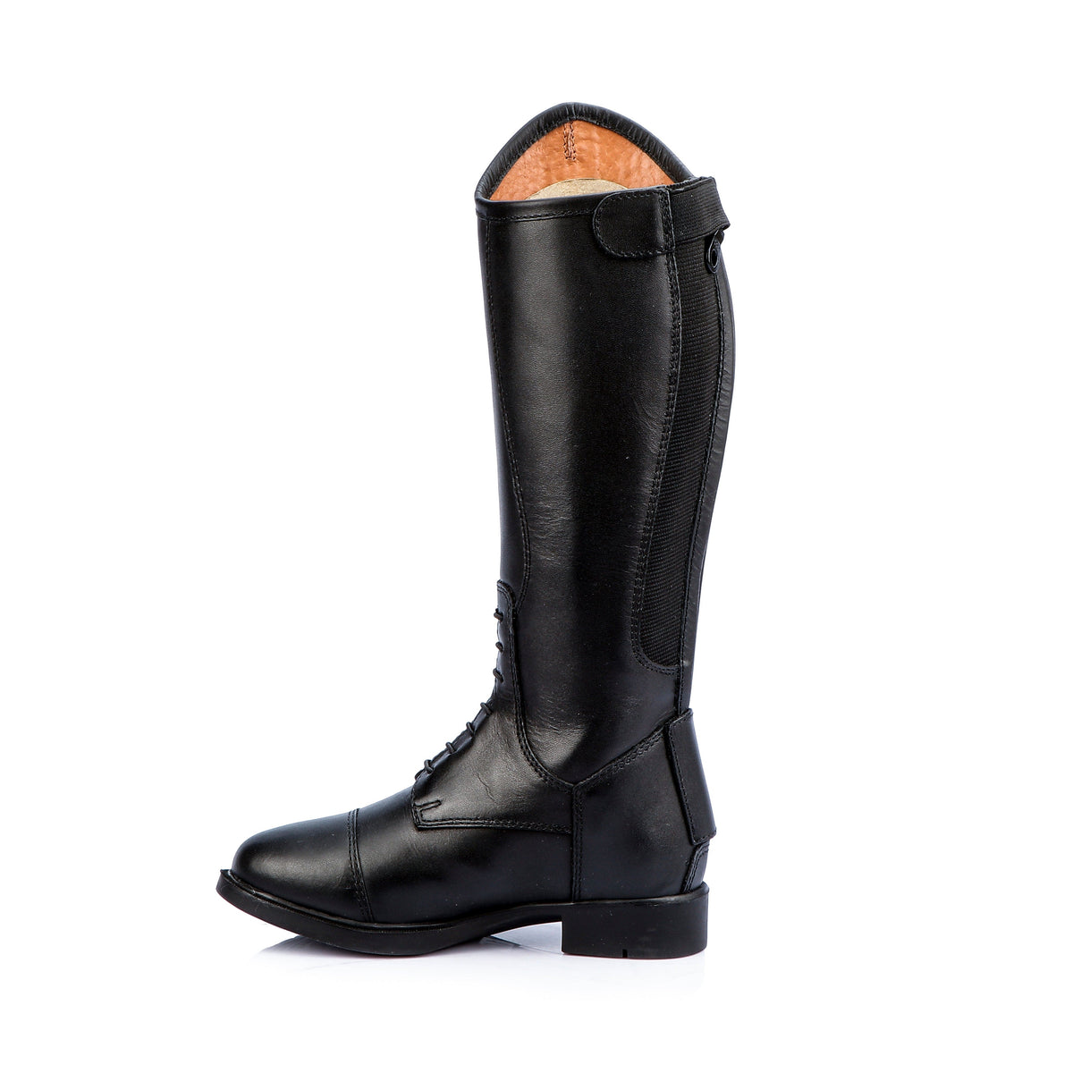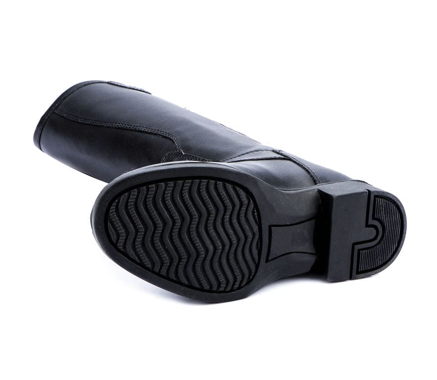 Description : Classically styled made from soft genuine leather  , yet exceptionally durable, this riding boot  is perfect for all-purposes. The added elasticated panel at the calf allows for greater movement and a comfortable fit, with a good grip sole. The leather lining provides calf support for riding. These boots are finished with a high-cut Spanish top, a plain  swagger tab , elasticated laces and a full-length, premium quality coiled YKK back zipper.