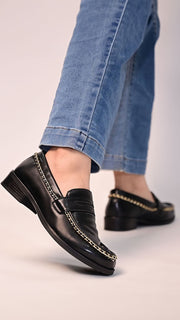 Description : Step up your style with our Black Chain Loafers. Crafted from premium material, these chic loafers feature a bold chain detail, perfect for both casual and formal occasions. Enjoy all-day comfort and elevate any outfit with this versatile essential.