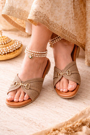 Description : Upgrade your everyday style with these chic flat sandals crafted from synthetic jute and brown synthetic material. The stylish cross-strap design is enhanced with an elegant buckle, offering both a secure fit and a modern look.